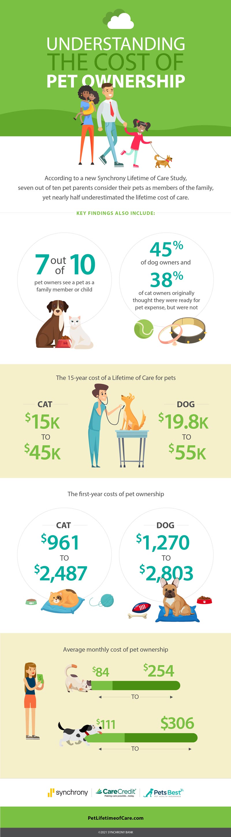 STAMFORD, CT – January 11, 2022 – According to a new Synchrony (NYSE: SYF) study entitled “Lifetime of Care,” seven out of ten pet parents consider their pets as members of the family, yet nearly half underestimated the lifetime cost of care, which ranges from $20K-$55K for dogs and $15K-$45K for cats.1 Additionally, approximately half of all pet owners who thought they were financially ready for unexpected pet expenses, were not, and would consider a financial solution dedicated to financing care for their pet.